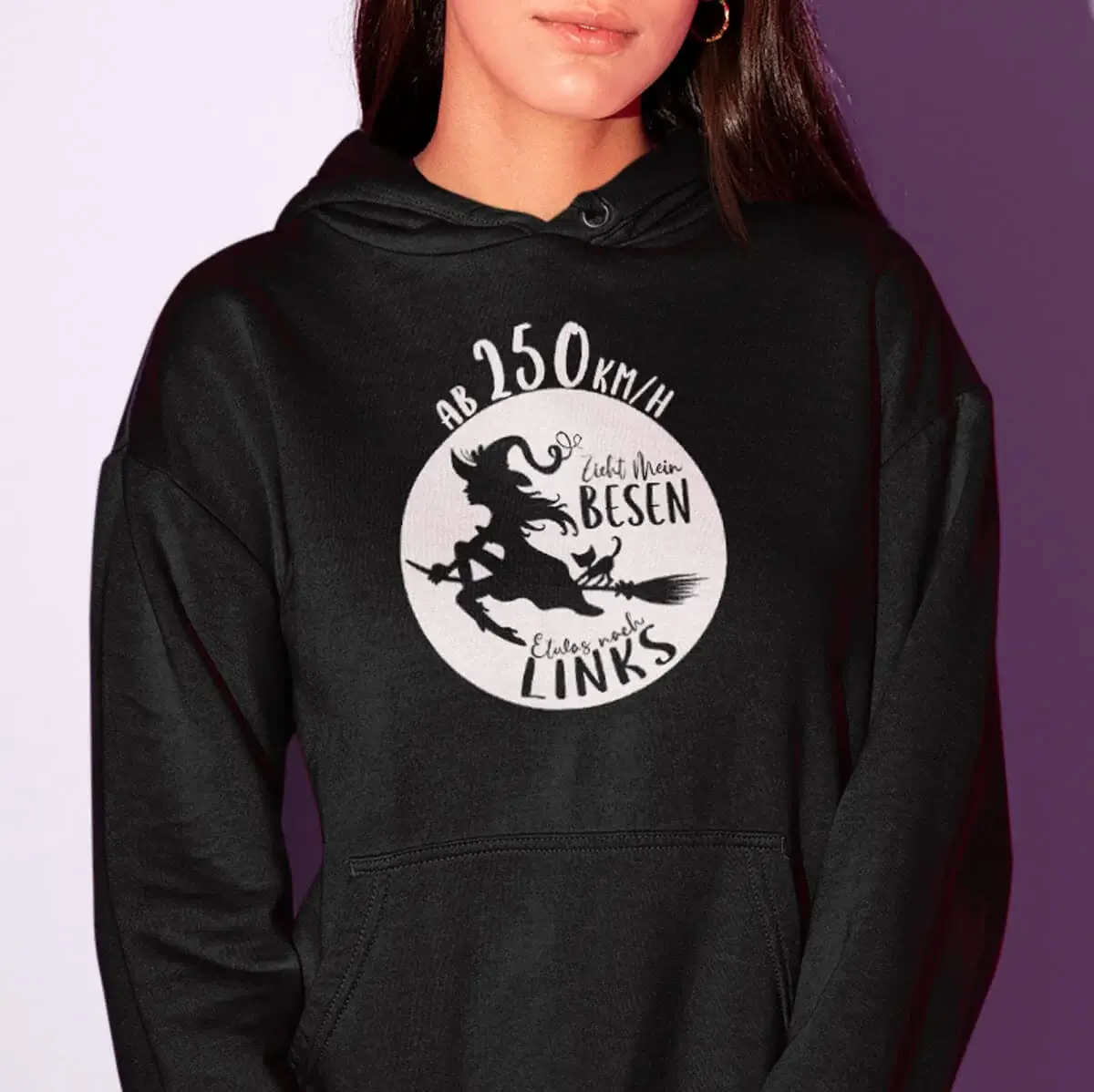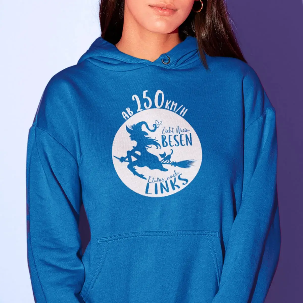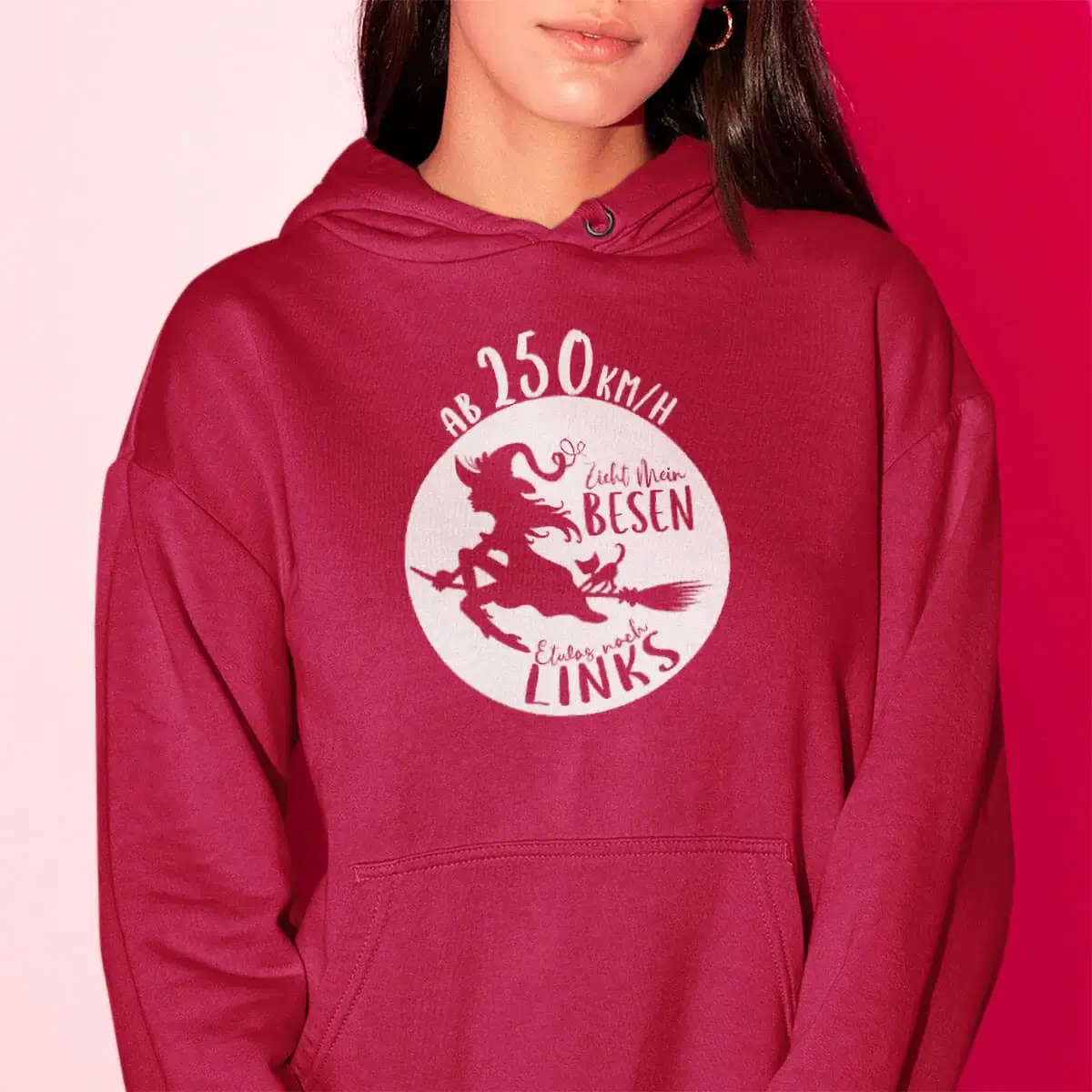 Erhältlich in den stylishen Farben Schwarz, Dark Purple, Peppermint, Sapphire Blue, Magenta Magic und Fire Red, ist dieser Hoodie ein echter Hingucker. Das freche Motiv einer fliegenden Hexe wird durch den humorvollen Spruch “Ab 250 km/h zieht mein Besen nach links” im Front- oder Rückendruck ergänzt und macht den Hoodie zum perfekten Statement-Piece für selbstbewusste Frauen mit Sinn für Humor.
