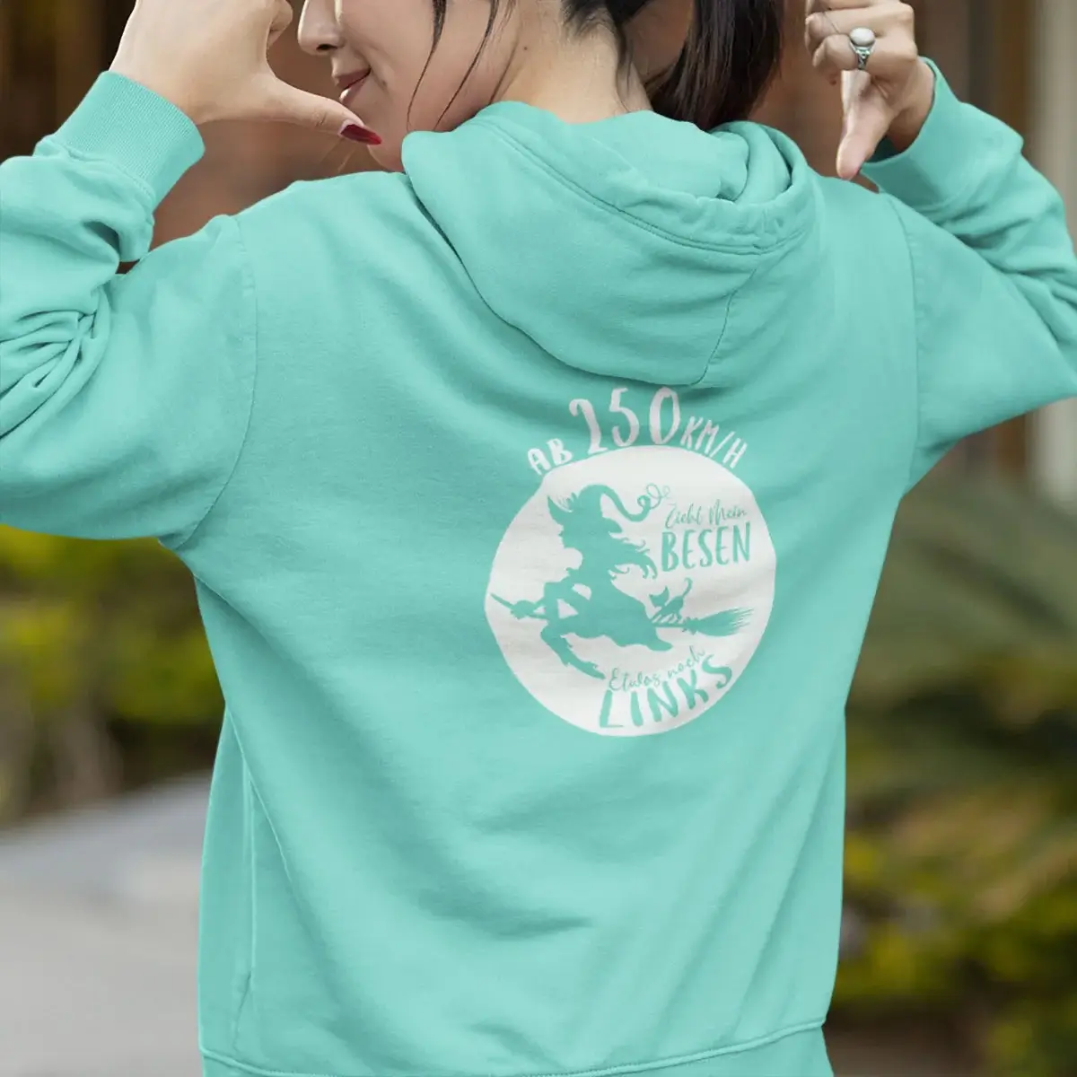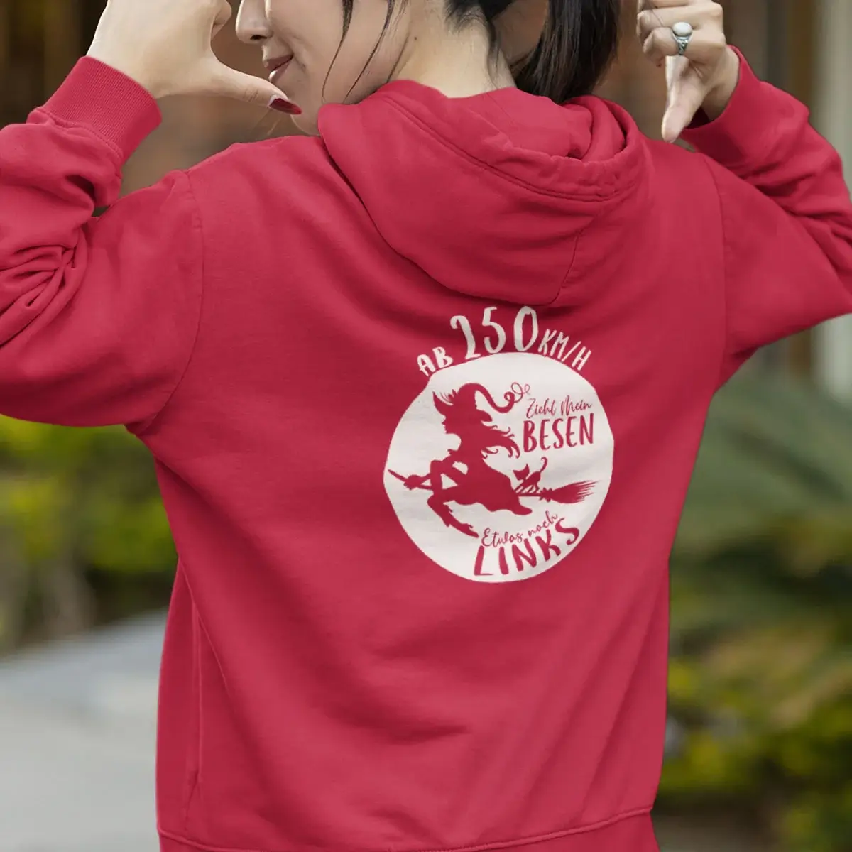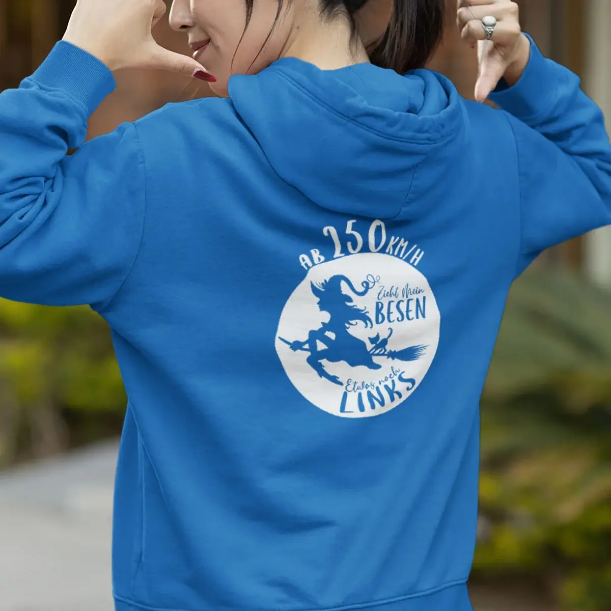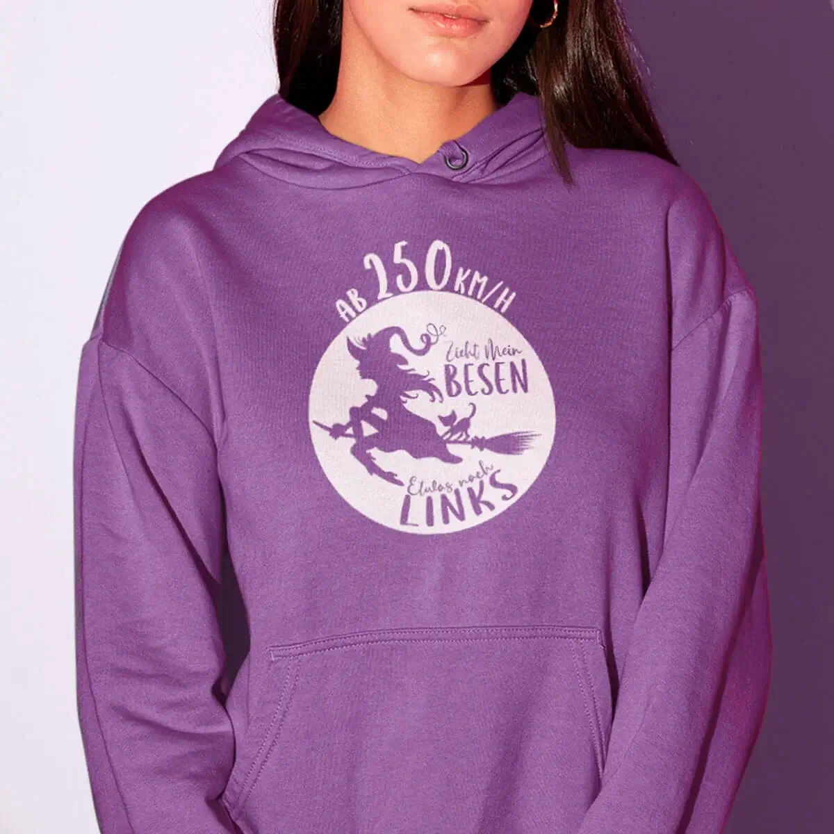 Erhältlich in den stylishen Farben Schwarz, Dark Purple, Peppermint, Sapphire Blue, Magenta Magic und Fire Red, ist dieser Hoodie ein echter Hingucker. Das freche Motiv einer fliegenden Hexe wird durch den humorvollen Spruch “Ab 250 km/h zieht mein Besen nach links” im Front- oder Rückendruck ergänzt und macht den Hoodie zum perfekten Statement-Piece für selbstbewusste Frauen mit Sinn für Humor.
