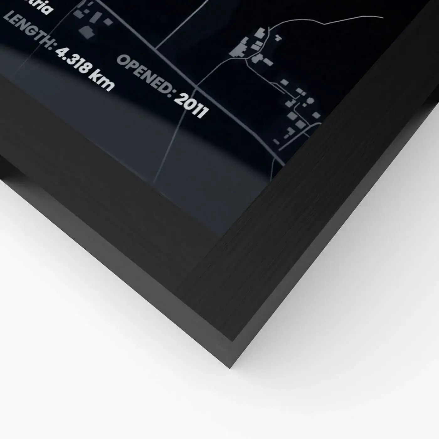 Der stilvolle schwarze Rahmen unterstreicht die ästhetische Schönheit und technische Perfektion der Strecke. Die einfache Montage ermöglicht es, ein Stück Rennsportgeschichte elegant und unkompliziert in dein Zuhause zu integrieren.