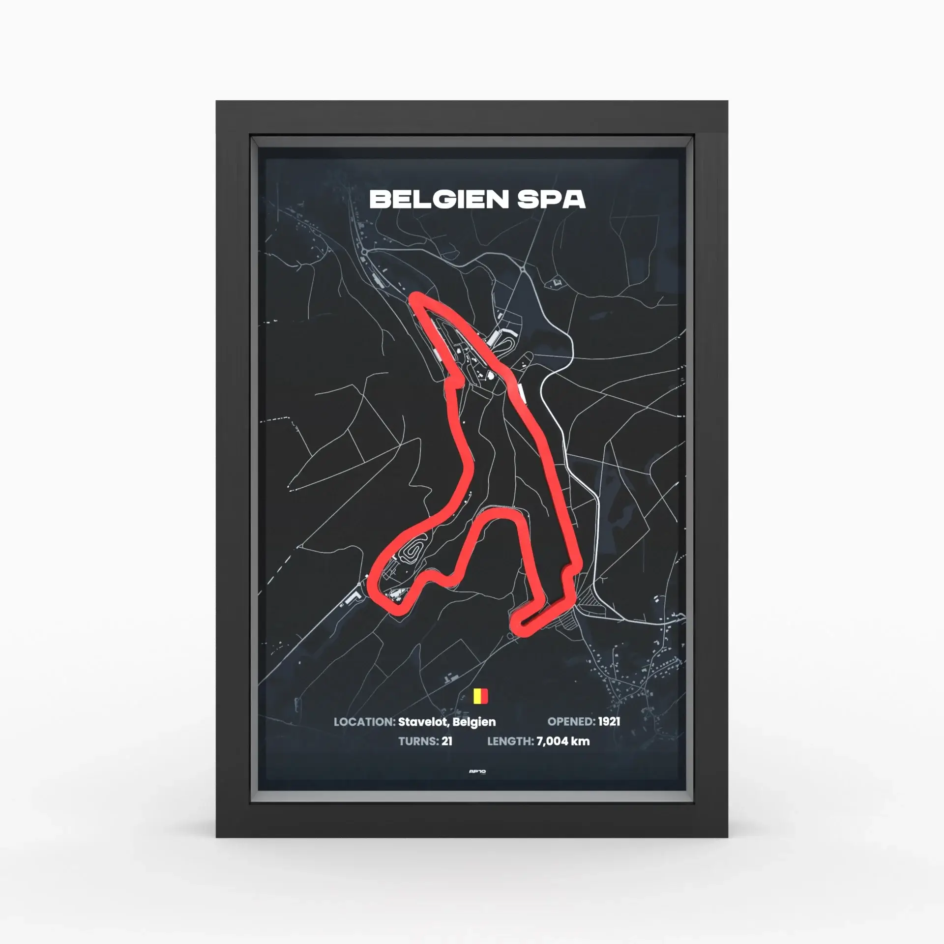 Unser 3D-Poster des Spa-Francorchamps Grand Prix zeichnet sich durch beeindruckende Detailtreue und hochwertige Verarbeitung aus. Die präzise 3D-gedruckte Strecke des Circuit de Spa-Francorchamps zeigt jede Kurve, jede Gerade und die einzigartigen Merkmale der Rennstrecke mit höchster Genauigkeit. Der Premium-Druck des Hintergrundposters in 300 DPI-Auflösung gewährleistet gestochen scharfe Bilder und lebhafte Farben, die die Atmosphäre des Spa-Francorchamps Grand Prix perfekt einfangen.